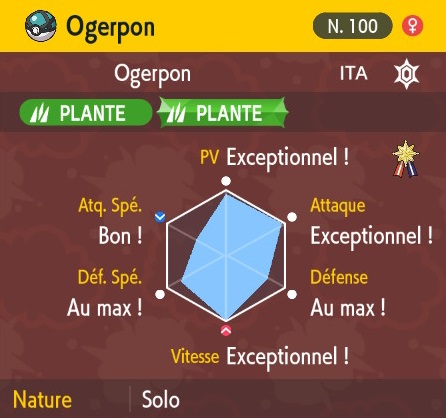 Vous pensiez que j'en entrainerais qu'un? Et bien non! C'est assez cool de voir que Ogerpon du DLC est toujours de nature Solo. Vu qu'il est sensé arriver de je ne sais pas quel région et que c'est celui qui accompagnais sont dresseur, c'est logique que ça soit toujours le même. On pourrait imaginer que dans sa région d'origine il y en ais de natures différentes, et pourquoi pas des mâles.